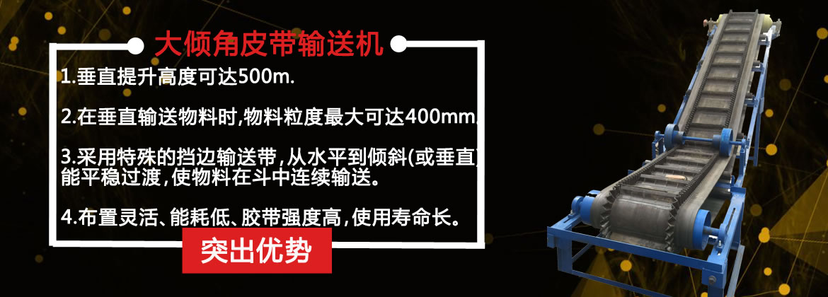 DJ型大傾角皮帶輸送機與普通式輸送機、斗式提升機、刮板輸送機比較其綜合技術性能都非常優(yōu)越.輸送量大可達6000m3/h垂直提升高度可達500m.在垂直輸送物料時物料粒度較大可達200mm,從水平到傾斜(或垂直)能平穩(wěn)過渡,能耗低、結構簡單、維護方便、皮帶強度高、使用壽命長.